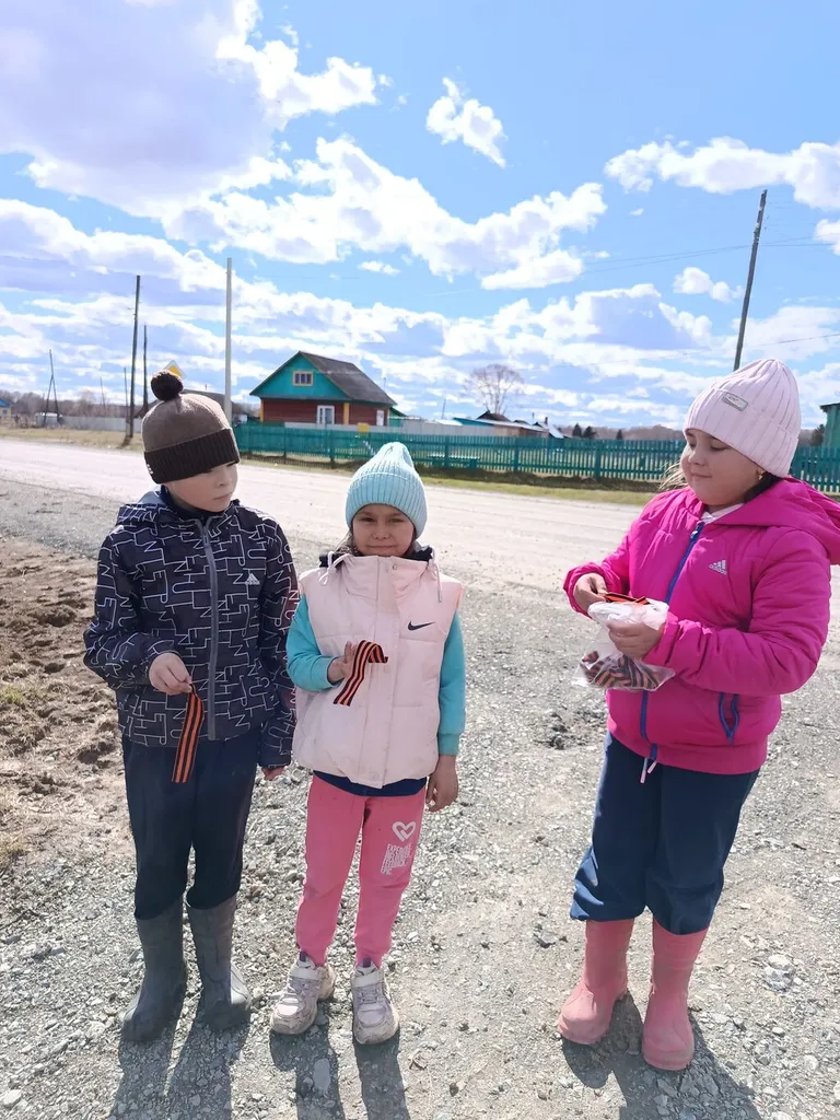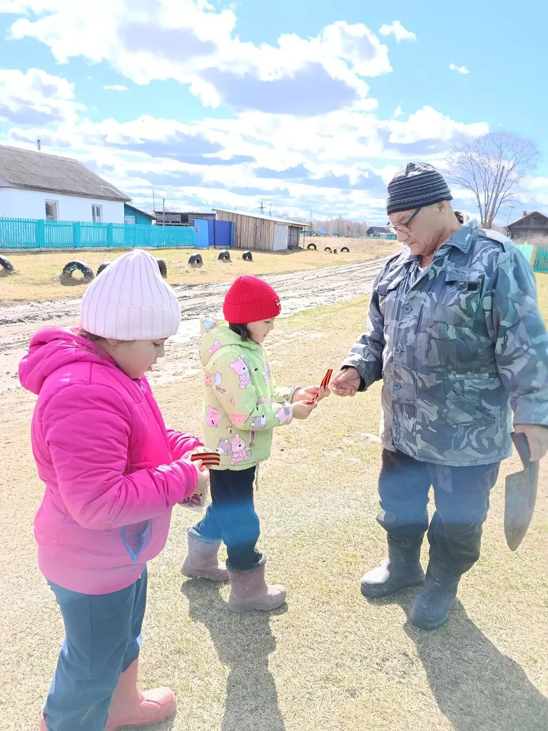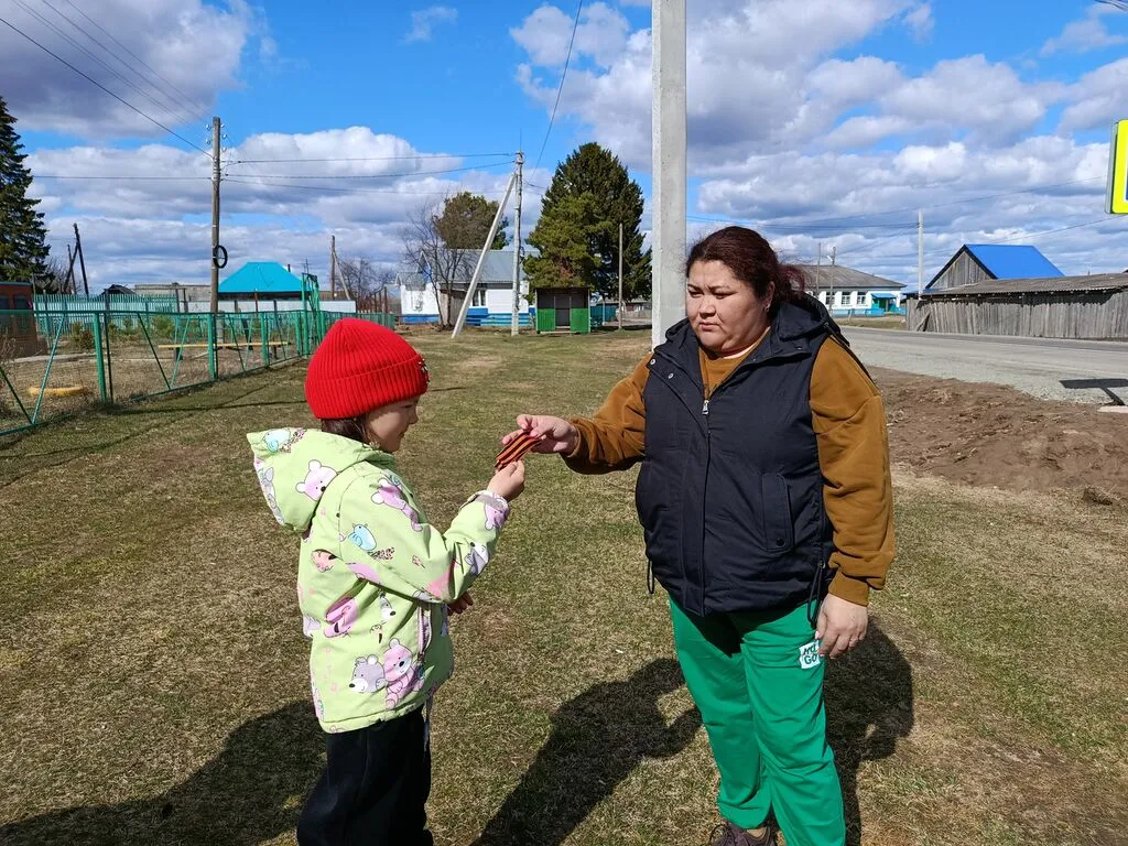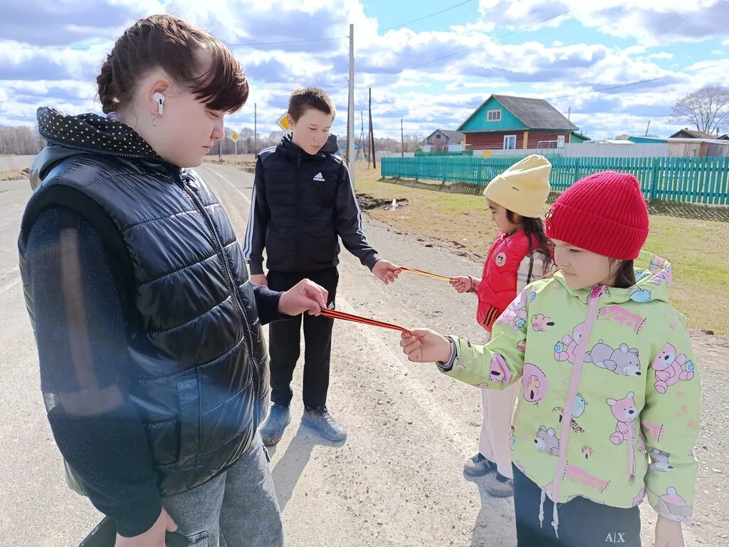 Ребята вручали георгиевские ленточки жителям, а заодно рассказывали односельчанам об истории возникновения символа, значении его цветов и о том, как правильно носить ленту.